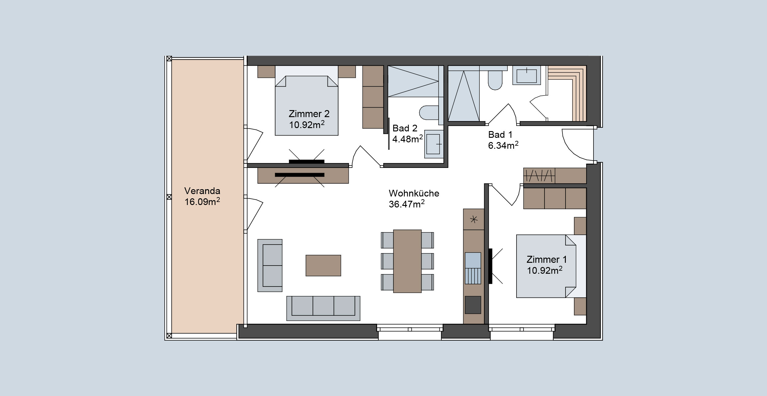 Auf knapp 70 Quadratmetern präsentiert sich die Wohnung mit hellen Räumen, eleganter Einrichtung und stimmigen Eichenholz-Elementen. Zwei Schlaf- und zwei Badezimmer sowie eine großzügige Wohnküche bieten angenehm Platz für vier Personen. Ob beim gemütlichen Essen in der Wohnküche, während der erholsamen Nachtruhe im Schlafzimmer, im Wohlfühl-Badezimmer mit Infrarotkabine oder beim Entspannen auf der Couch vor einem der Flat-TVs – hier lässt es sich leben. Von der Veranda eröffnet sich ein einmaliger Blick auf die umliegenden Berge.