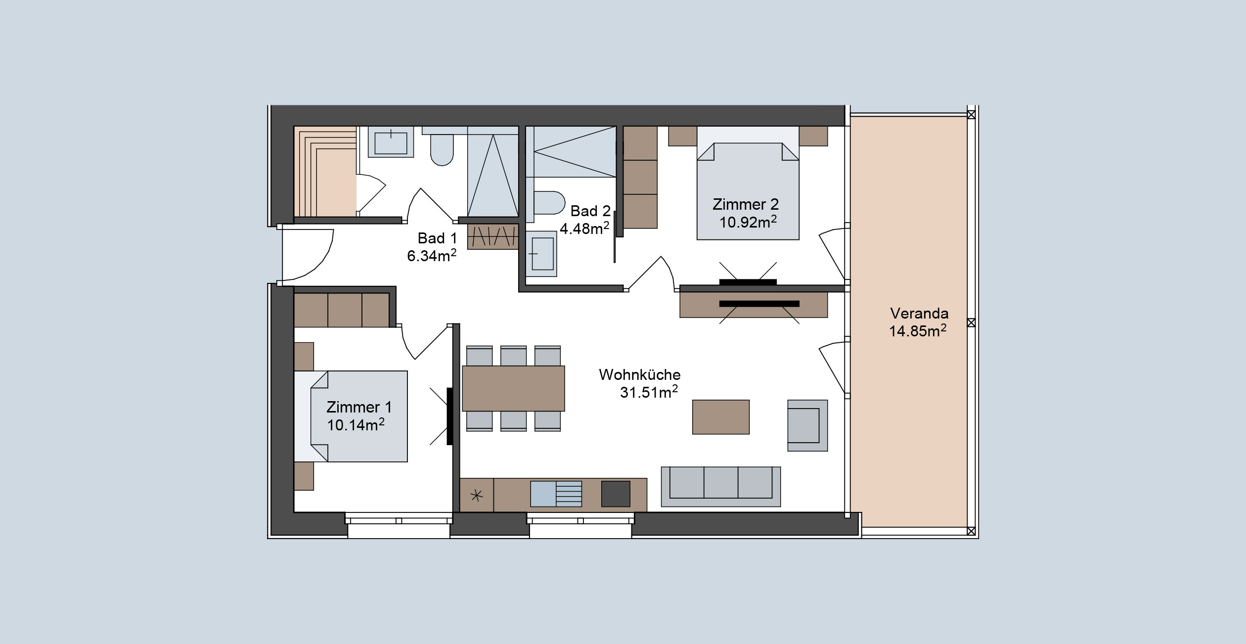 Auf knapp 70 Quadratmetern präsentiert sich die Wohnung mit hellen Räumen, eleganter Einrichtung und stimmigen Eichenholz-Elementen. Zwei Schlaf- und zwei Badezimmer sowie eine großzügige Wohnküche bieten angenehm Platz für vier Personen. Ob beim gemütlichen Essen in der Wohnküche, während der erholsamen Nachtruhe im Schlafzimmer, im Wohlfühl-Badezimmer mit Infrarotkabine oder beim Entspannen auf der Couch vor einem der Flat-TVs – hier lässt es sich leben. Von der Veranda eröffnet sich ein einmaliger Blick auf die umliegenden Berge.